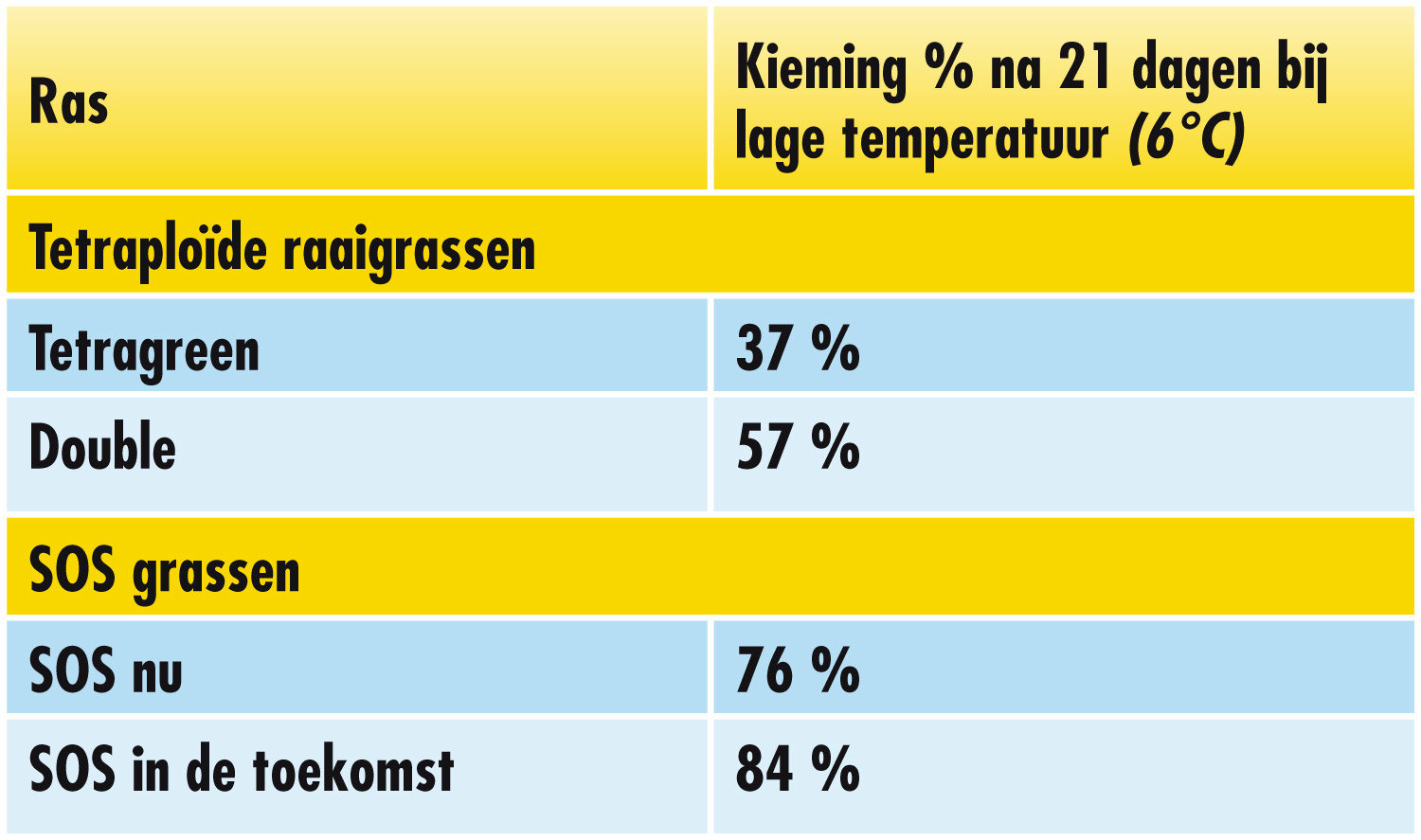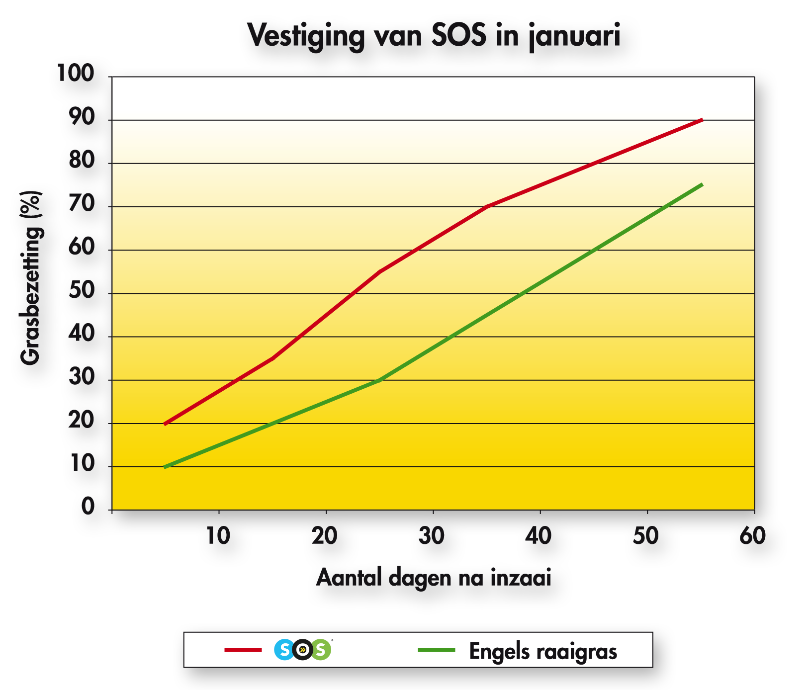 Tetraploïde Engels raaigrassen worden op de markt vaak als een goed alternatief gezien voor SOS® op sportvelden. Tetra’s groeien over het algemeen snel, maar uit laboratoriumonderzoek blijkt dat SOS® een hogere kwaliteit heeft en dat de snelheid van vestiging (al bij 6°C) beter is.