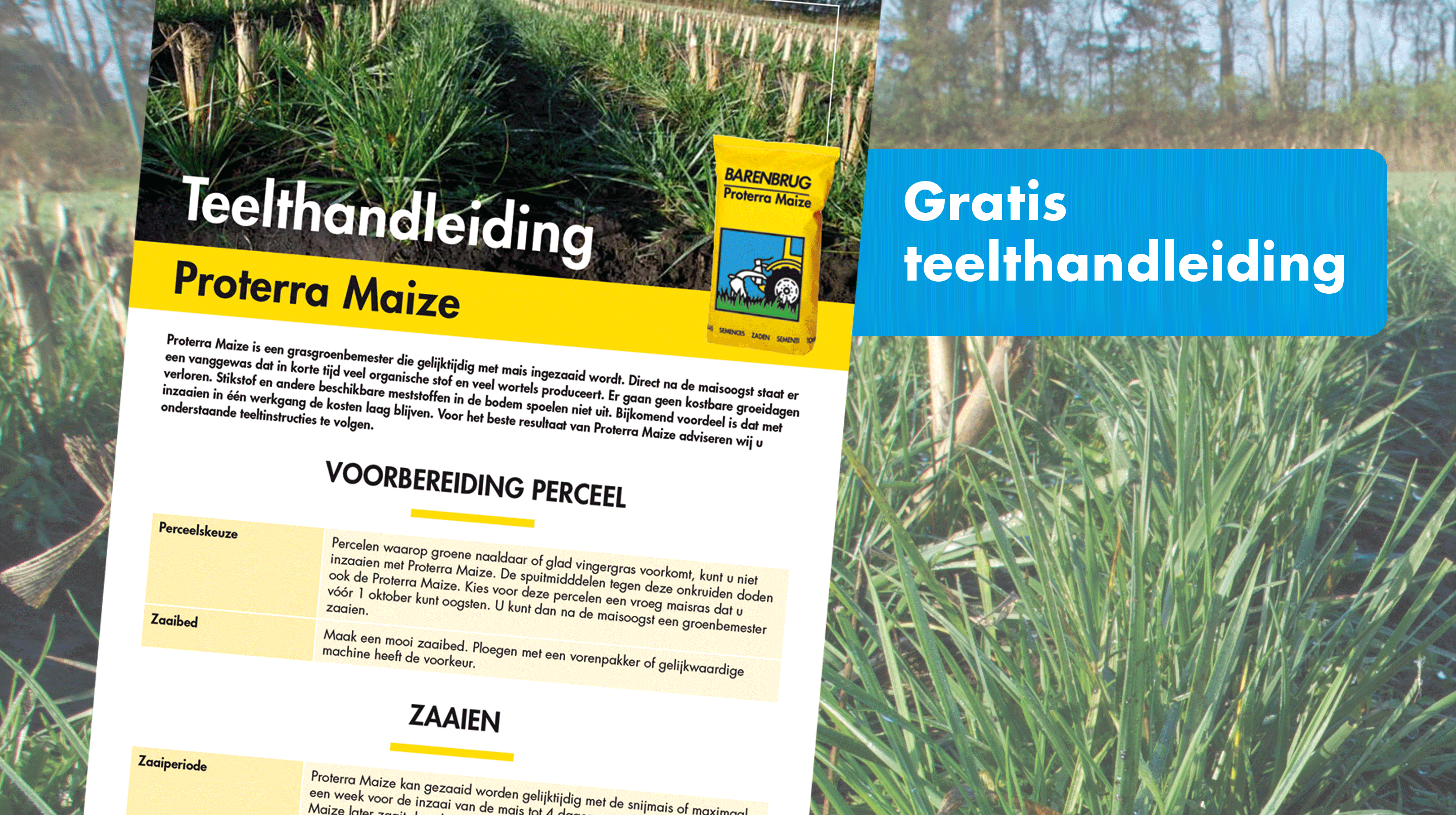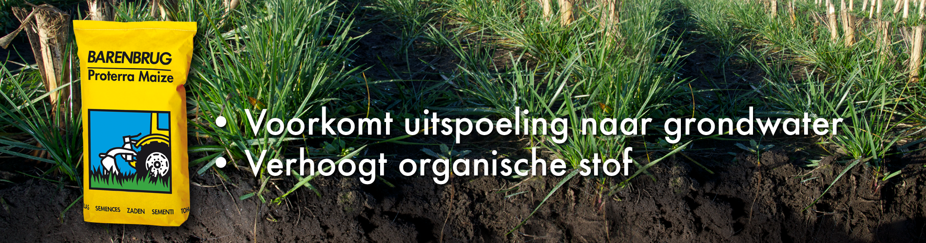 Grasgroenbemester Proterra Maize kan gezaaid worden gelijktijdig met mais of maximaal een week voor de inzaai van mais tot vier dagen erna. Indien u Proterra Maize later zaait dan mais, wees dan voorzichtig met de kiemende maisplantjes. De zaaizaadhoeveelheid is 15 kg/ha.